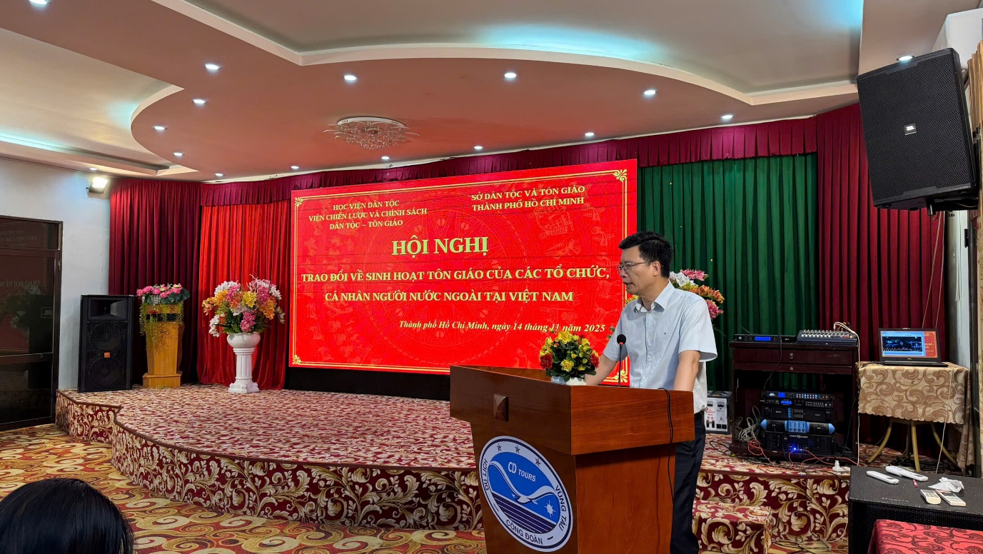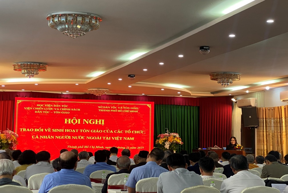 Ngày 14/11/2025, tại thành phố Hồ Chí Minh, Viện Chiến lược và Chính sách Dân tộc - Tôn giáo, Học viện Dân tộc, Bộ Dân tộc và Tôn giáo phối hợp với Sở Dân tộc và Tôn giáo thành phố Hồ Chí Minh tổ chức Hội nghị trao đổi về sinh hoạt tôn giáo của các tổ chức, cá nhân người nước ngoài tại Việt Nam. Tham dự Hội nghị: Ông Nguyễn Tiến Trọng, Phó Trưởng Ban Tôn giáo Chính phủ; TS. Lê Thị Liên, Viện trưởng Viện Chiến lược và Chính sách Dân tộc - Tôn giáo, Học viện Dân tộc; đại diện Sở Dân tộc và Tôn giáo thành phố Hà Nội, thành phố Hồ Chí Minh cùng các vị chức sắc, chức việc, nhà tu hành các tôn giáo (Công giáo, Phật giáo, Tin Lành, Cao Đài, Giáo hội Cơ đốc Phục lâm Việt Nam, Hồi giáo, BaHa’i và Tịnh độ Cư sĩ Phật hội Việt Nam).